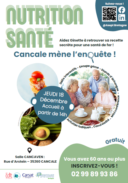 La Ville de Cancale, en partenariat avec le CLIC Côte d’Émeraude et l’ASEPT Bretagne, organise un après-midi dédié à la prévention et à la nutrition pour les seniors, financé par la CARSAT Bretagne.