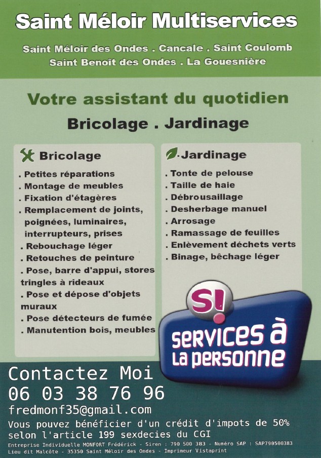20 rue des Magdeleines35350 Saint-Méloir des Ondes Services à la personne pour les tâches des tâches courantes ou techniques, pour des besoins réguliers ou ponctuels en ménage, repassage, nettoyage de vitres, jardinage, bricolage, garde d’enfants…